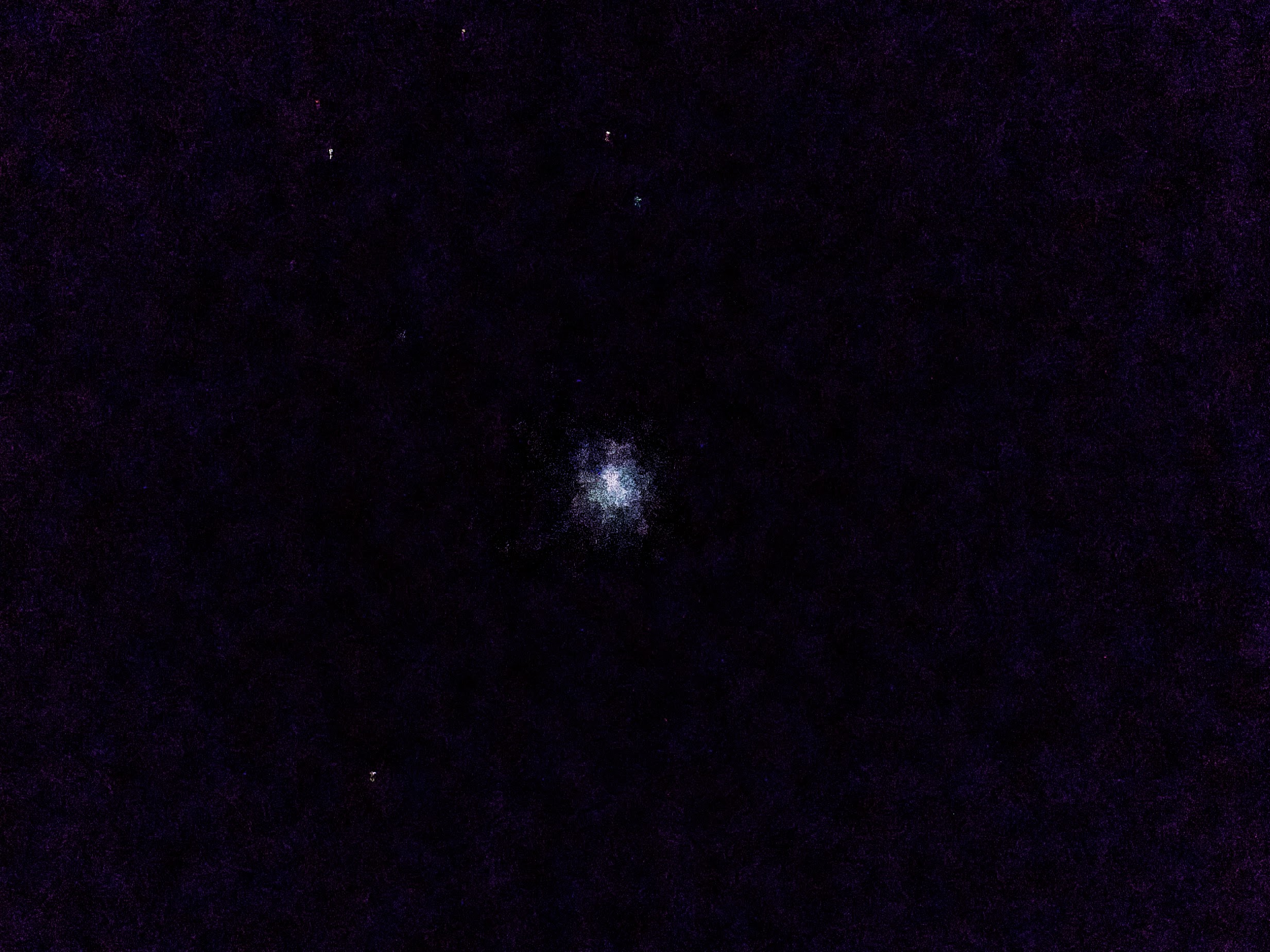 Dieses Bild entstand am 8. August 2020 und markiert einen persönlichen Erfolg. Nach zwei Abenden, an denen ich den Kugelsternhaufen im Herkules einfach nicht finden konnte – vermutlich, weil ich in der Region der Sterne ein wenig orientierungslos war – war der dritte Anlauf ein voller Erfolg. Innerhalb von nicht einmal einer Minute hatte ich ihn im Okular. Der visuelle Eindruck bei 32mm Vergrößerung war ein kleiner, fast perfekt runder, nebliger Ball. Sobald ich die Vergrößerung erhöhte, begann das „Magische“: Die äußeren Bereiche des Nebels lösten sich in unzählige winzige Lichtpunkte auf. Diese Aufnahme ist mein Versuch, diesen ersten Moment, in dem sich der „Nebel“ in Sterne verwandelte, mit dem Smartphone durch das Okular festzuhalten. Es ist vielleicht nicht perfekt scharf, aber es erinnert mich genau an das Gefühl, als ich das erste Mal die Einzelsterne in M13 sah.