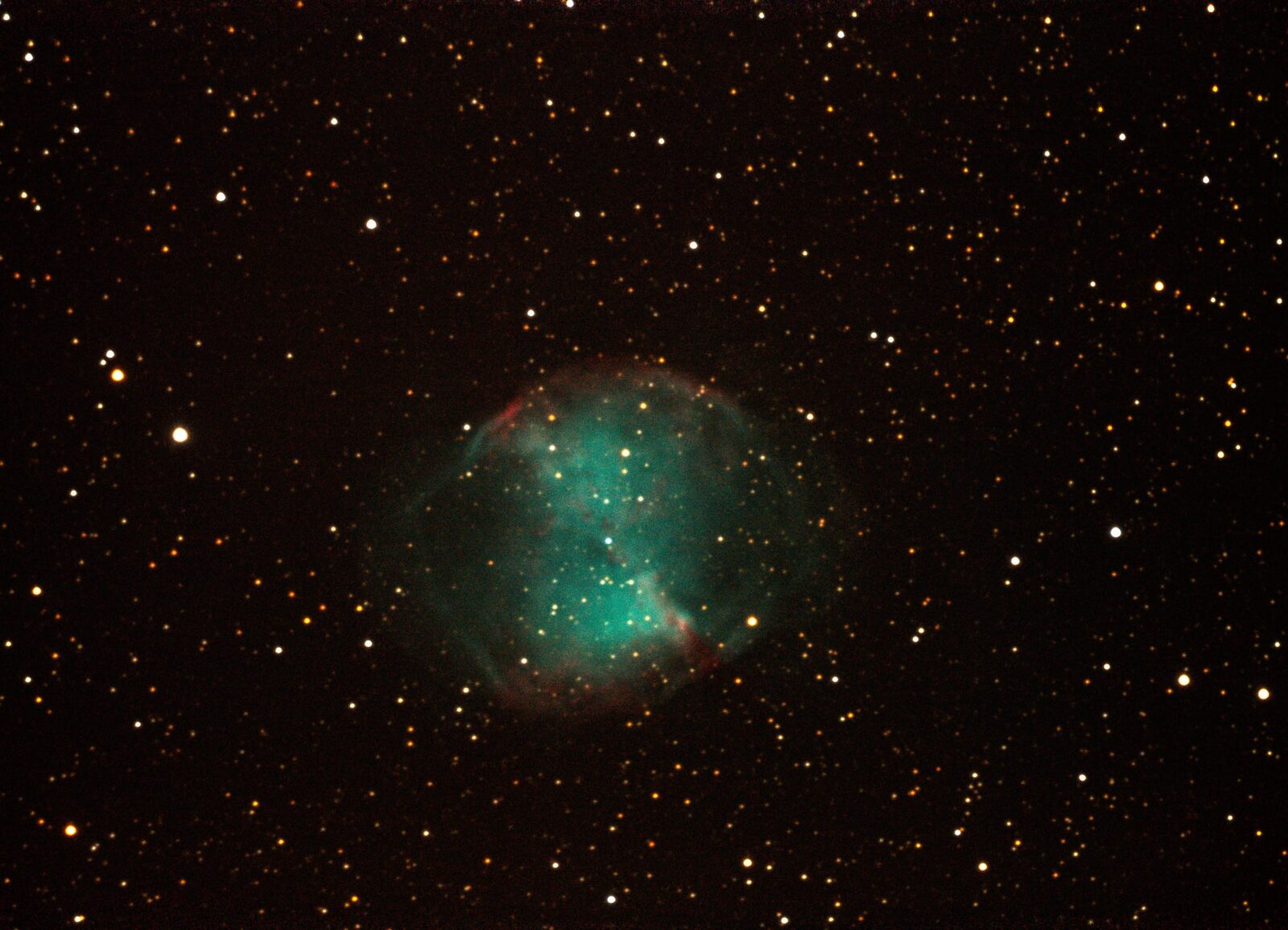 Am 23. Oktober 2021 stand M27 im Fokus eines ganz besonderen Testabends. Es war mein erster Versuch mit meiner gebrauchten Canon EOS 1100D in Kombination mit der EOS Utility Software. Mein Hauptziel war es, das System zu kalibrieren, weshalb ich bewusst auf PHD2 und Autoguiding verzichtet habe. Die Nachführung lag rein in den Händen der azimutalen Montierung des Meade LX200R 14″. Bei 25 Sekunden Belichtungszeit pro Einzelbild zeigte sich schnell, wo die mechanischen Grenzen liegen: Von den knapp 50 Aufnahmen war nur etwa die Hälfte brauchbar, da bei den übrigen die Bildfelddrehung bereits für verzogene, eierförmige Sterne sorgte. Eine wichtige Erkenntnis, die zeigt, wie entscheidend die Belichtungszeit in Kombination mit der Montierungstechnik ist.