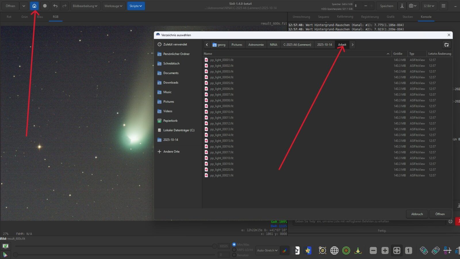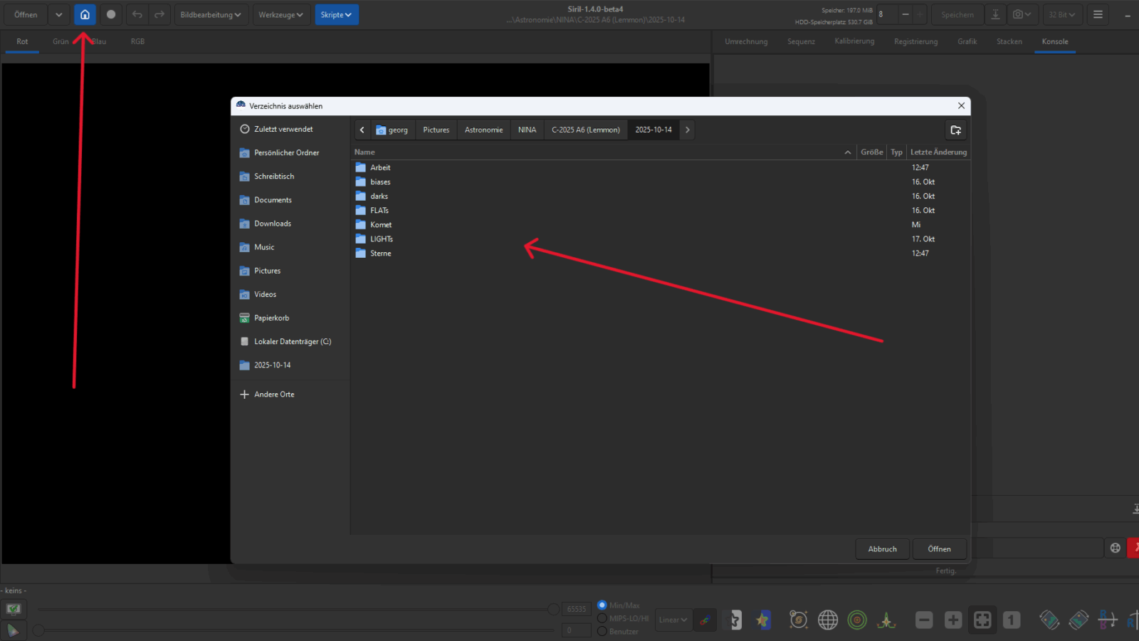 In Siril wählen wir den Ordner „Arbeit“ als neues Heimverzeichnis.