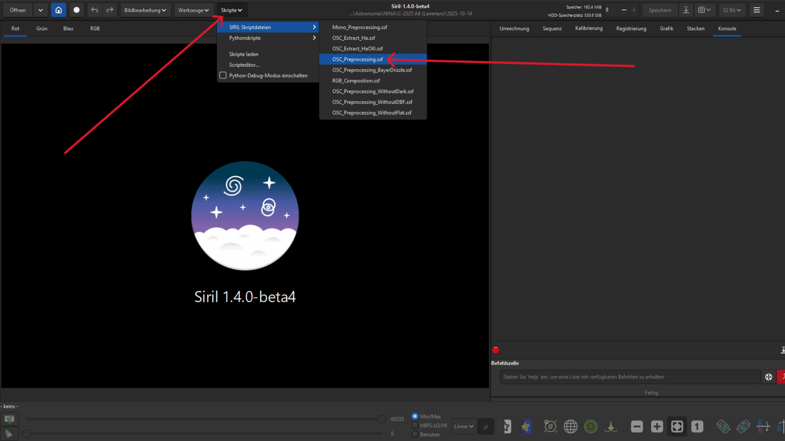 Als Nächstes wird in Siril das geeignete Preprocessing-Skript über „Skripte“ → „Siril Skriptdateien“ ausgewählt.