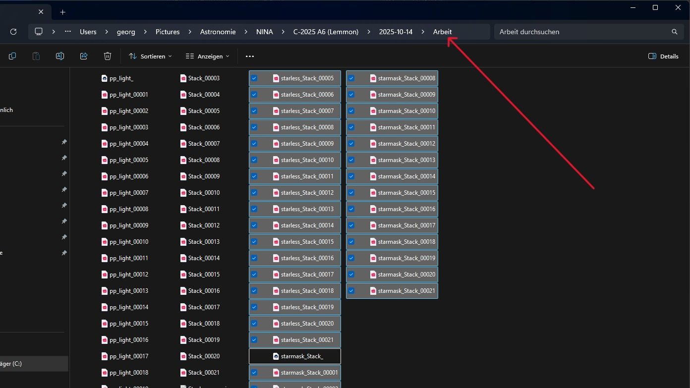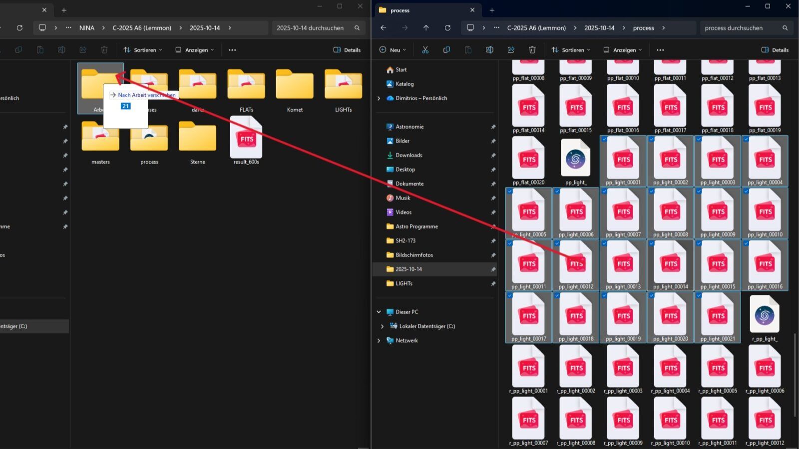 Im letzten Schritt der Vorbereitung werden die starless_Stack…-Dateien in den Ordner „Komet“ und die starmask_Stack…-Dateien in den Ordner „Sterne“ verschoben.