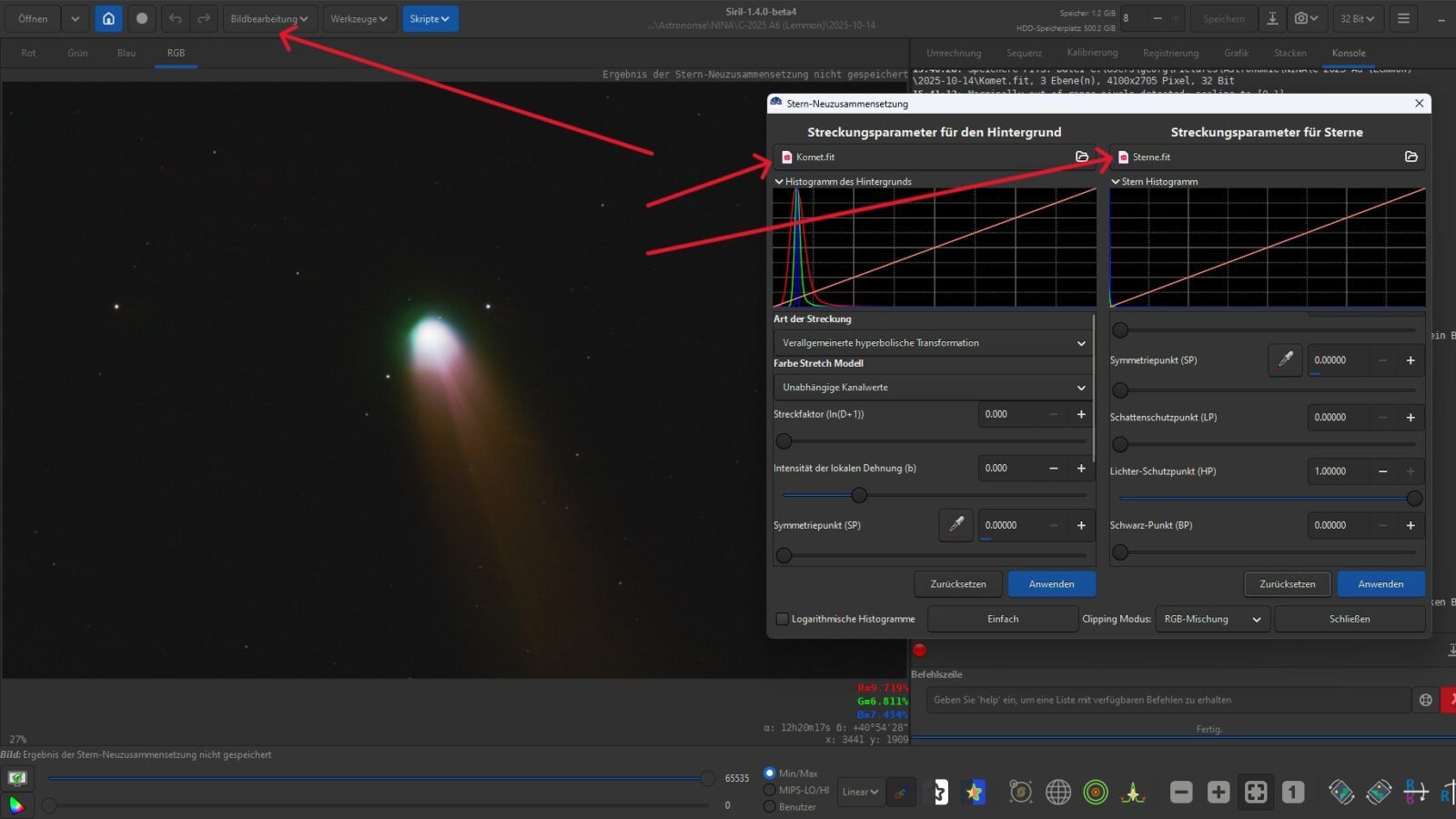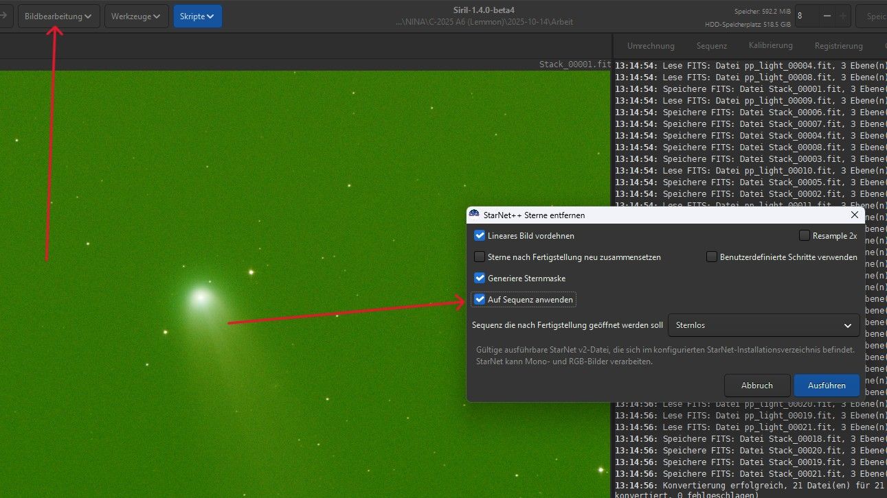 Unter Siril ist es mit einem geringen Mehraufwand möglich, die Strichspuren bei der Sternenentfernung sowie weitestgehend auch die Artefakte bei der Kometenentfernung zu vermeiden. Im Folgenden werden die dafür notwendigen Schritte detailliert beschrieben.