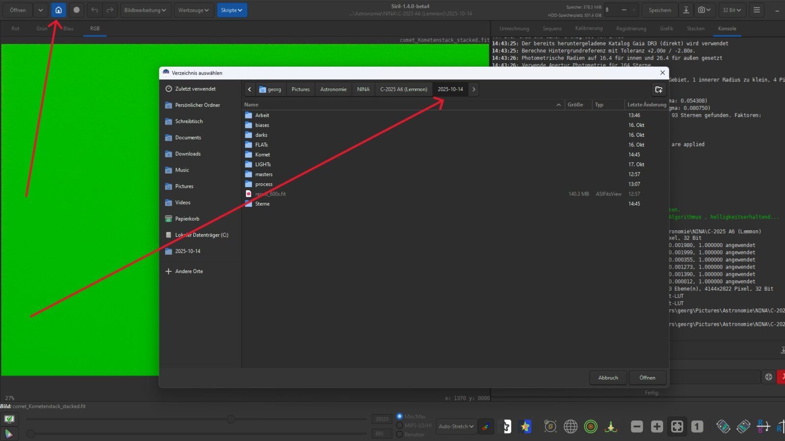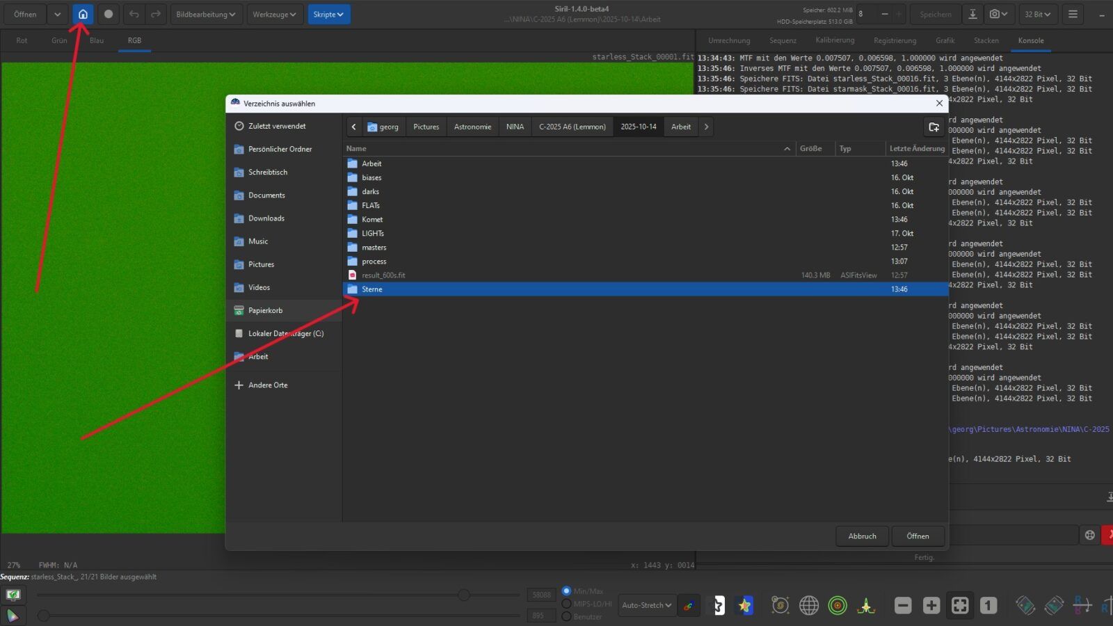 In Siril wechseln wir abermals das Heimverzeichnis und wählen diesmal den Ordner „Sterne“ dafür aus.