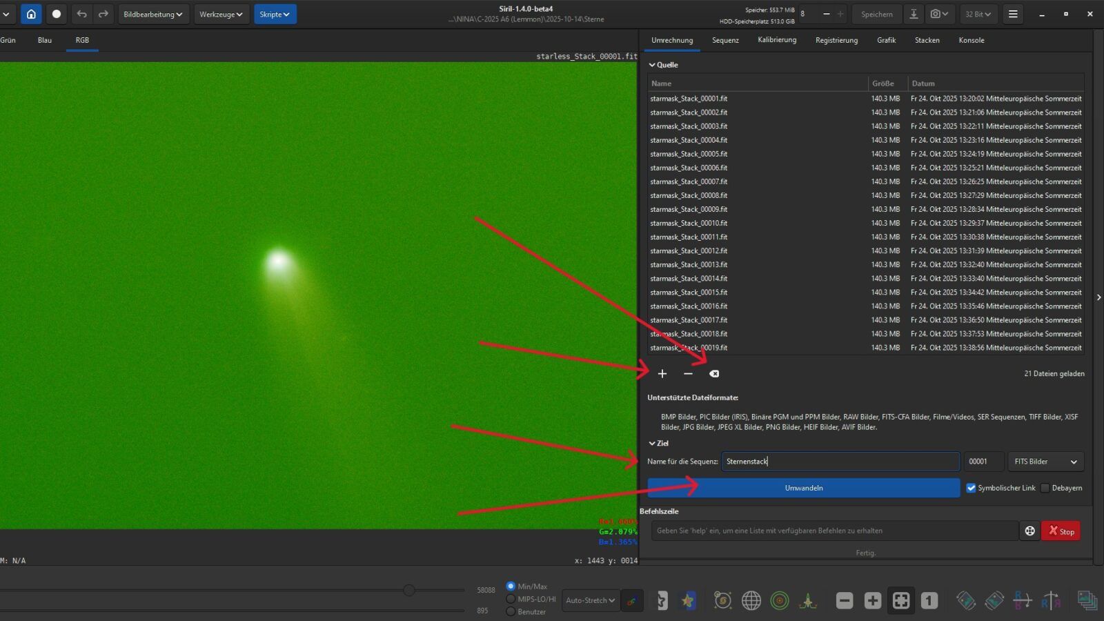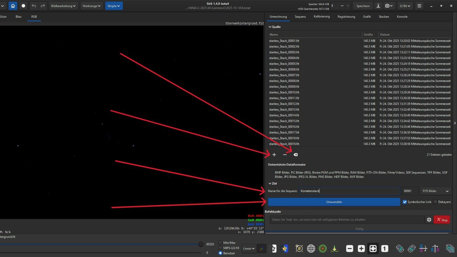 Im Reiter „Umrechnung“ löschen wir mit dem Backspace-Symbol wieder alle Dateien und laden über das „+“ Symbol alle starless_Stack…-Dateien (die sternenlosen Bilder).