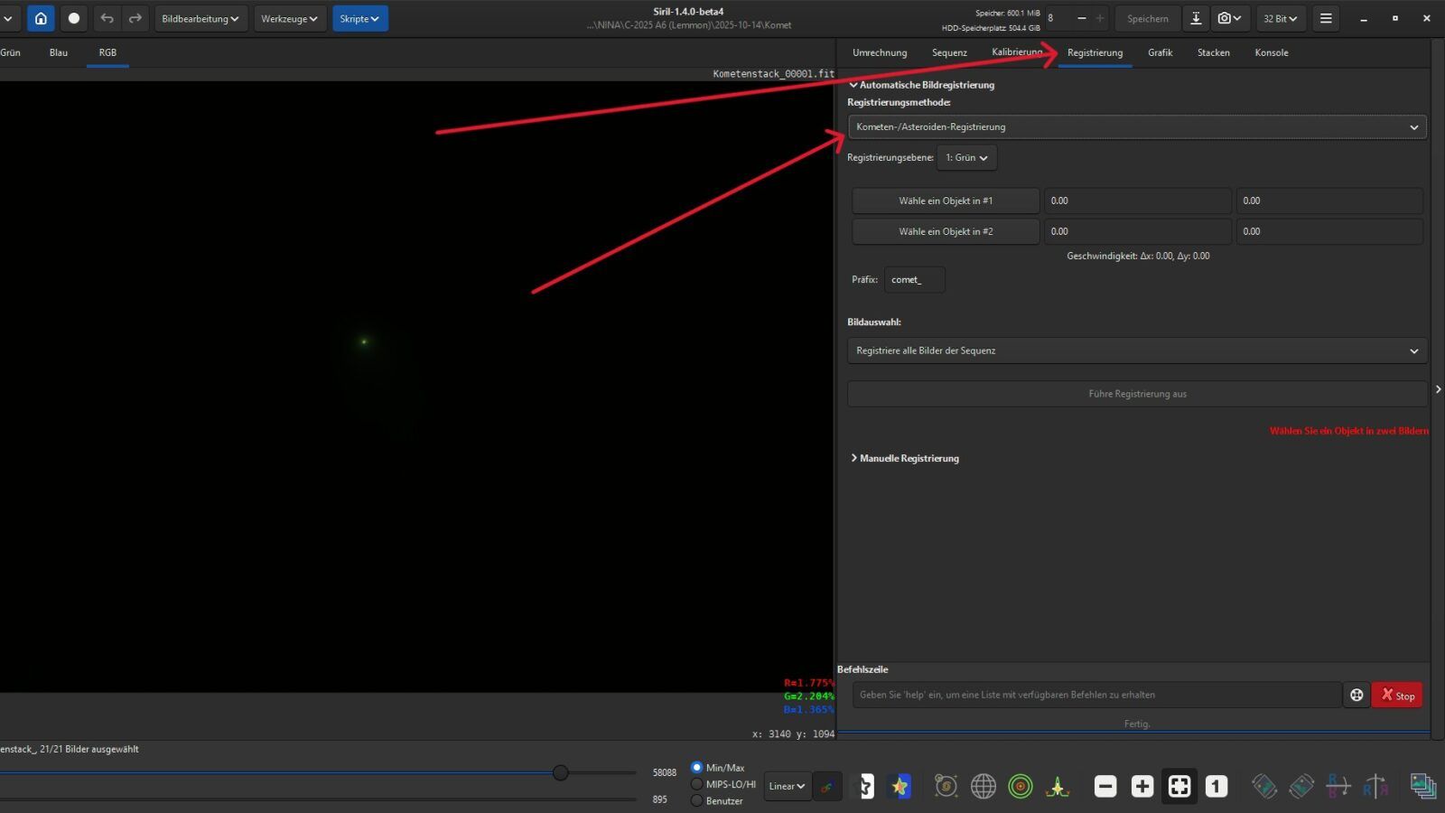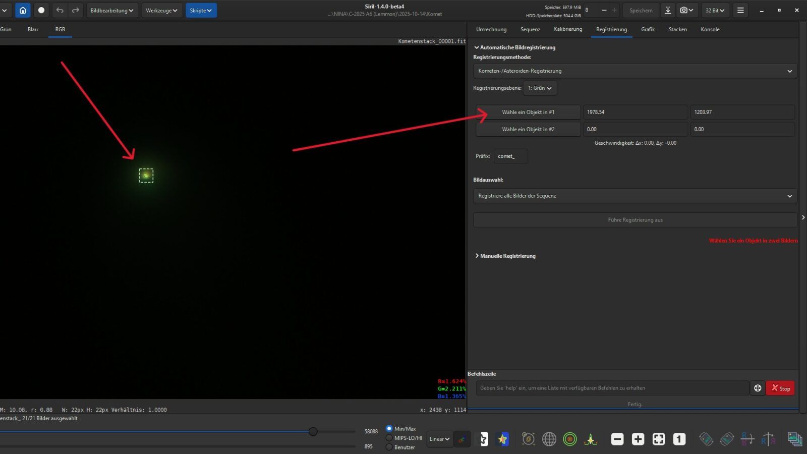 Im Referenzbild wird der Kometenkern mit einem Rechteck umrandet. Dann klicken wir auf „Wähle ein Objekt in 1#“.