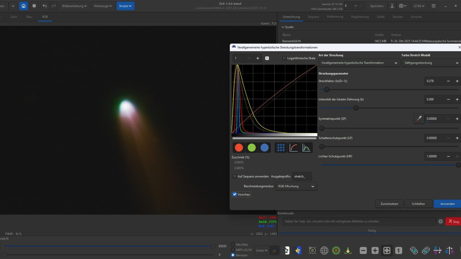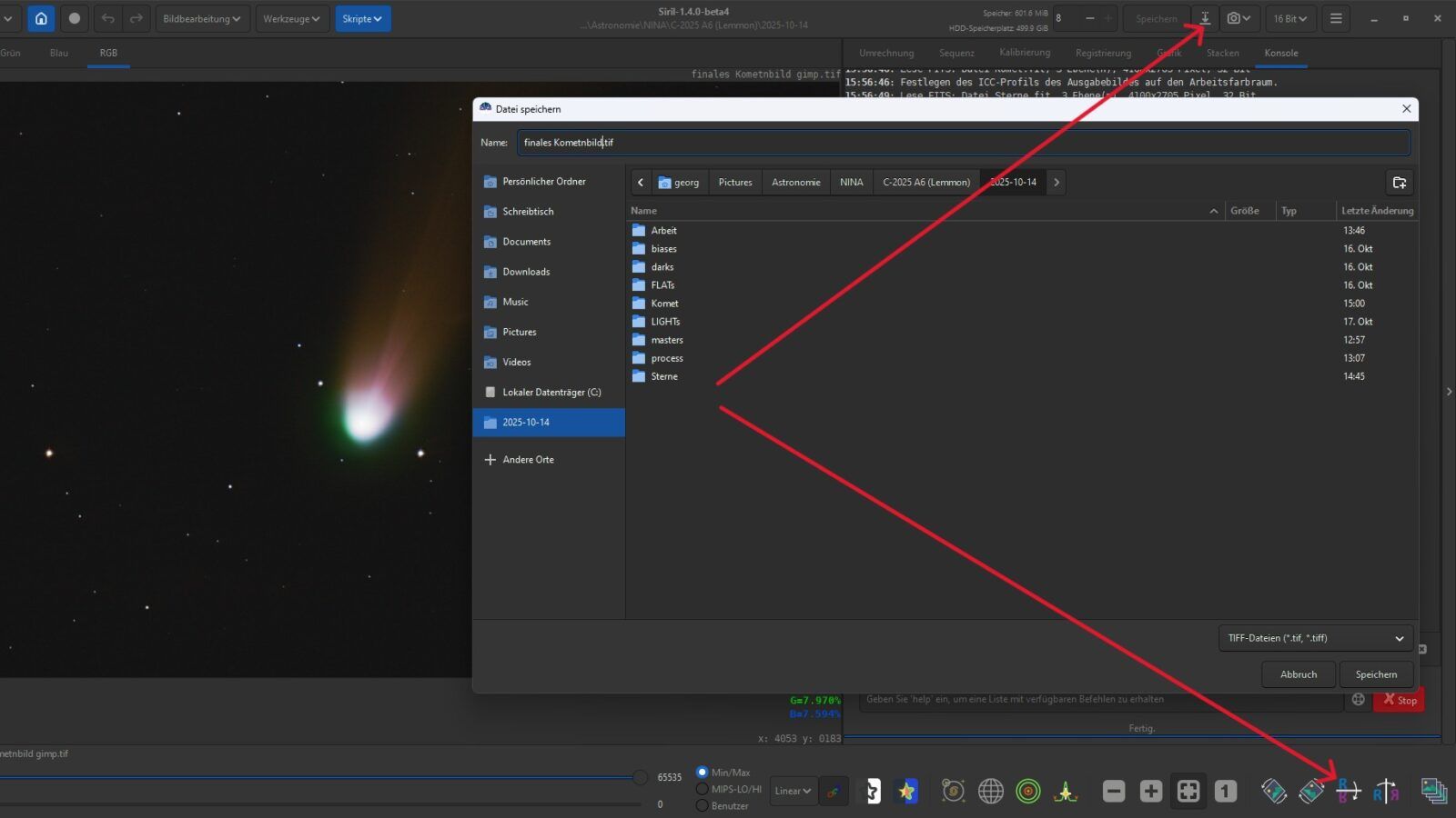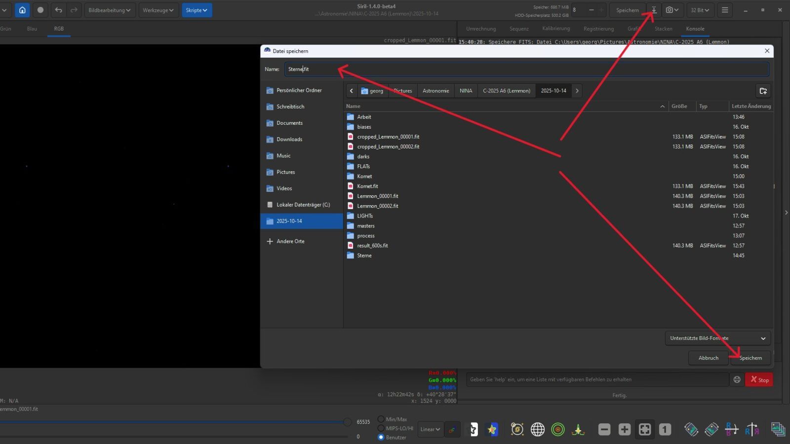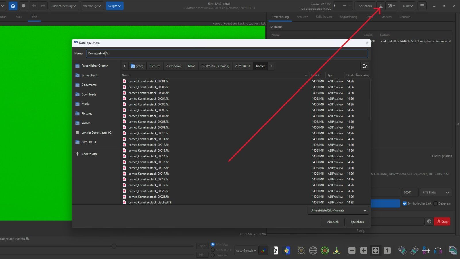Als letzten Schritt speichern wir das noch lineare Bild mit dem Namen „Kometenbild“ als 32-bit Fließkomma Fits ab.