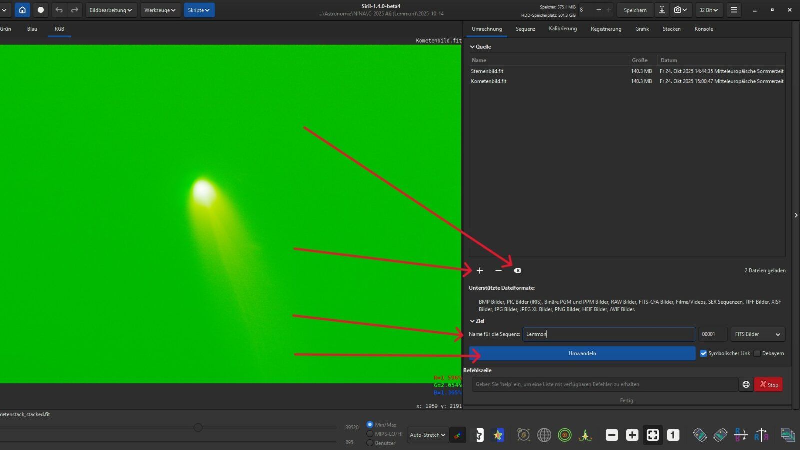 Im Reiter „Umrechnung“ löschen wir wiederholt alle Dateien und laden über das „+“ Symbol das „Sternenbild“ aus dem Ordner „Sterne“ und das „Kometenbild“ aus dem Ordner „Komet“.