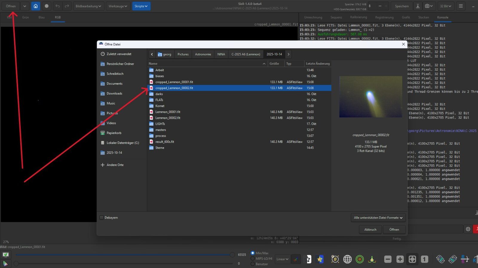 Wir öffnen jetzt das gecroppte und gestackte Sternenbild „cropped_Lemmon_00001.fits“ (oder eben die andere Datei), welches das gecroppte und gestackte Sternenbild ist.