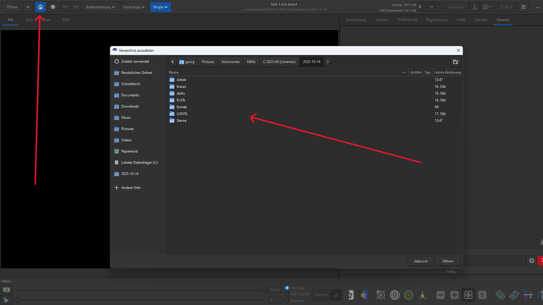 In Siril wählen wir den Ordner „Arbeit“ als neues Heimverzeichnis.