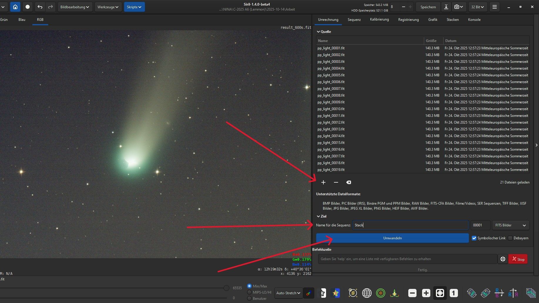 Die neue Sequenz nennen wir einfach „Kometenstack“) und konvertieren diese.