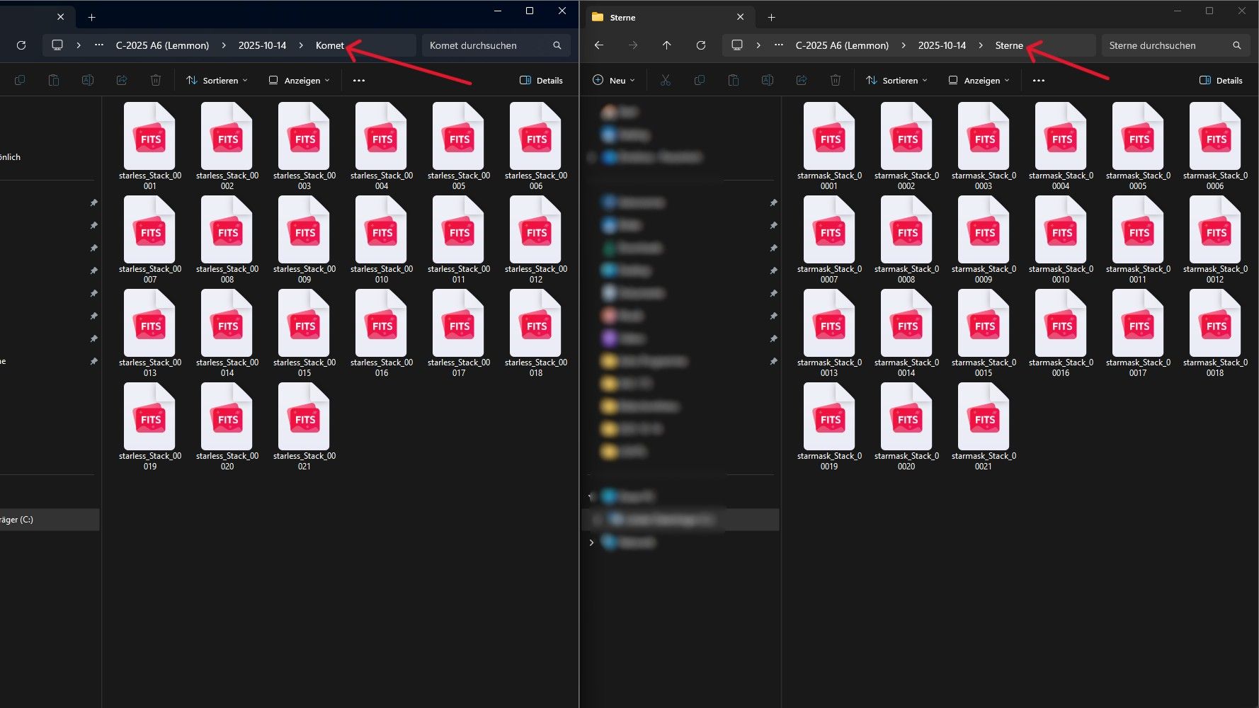 Im letzten Schritt der Vorbereitung werden die starless_Stack…-Dateien in den Ordner „Komet“ und die starmask_Stack…-Dateien in den Ordner „Sterne“ verschoben.