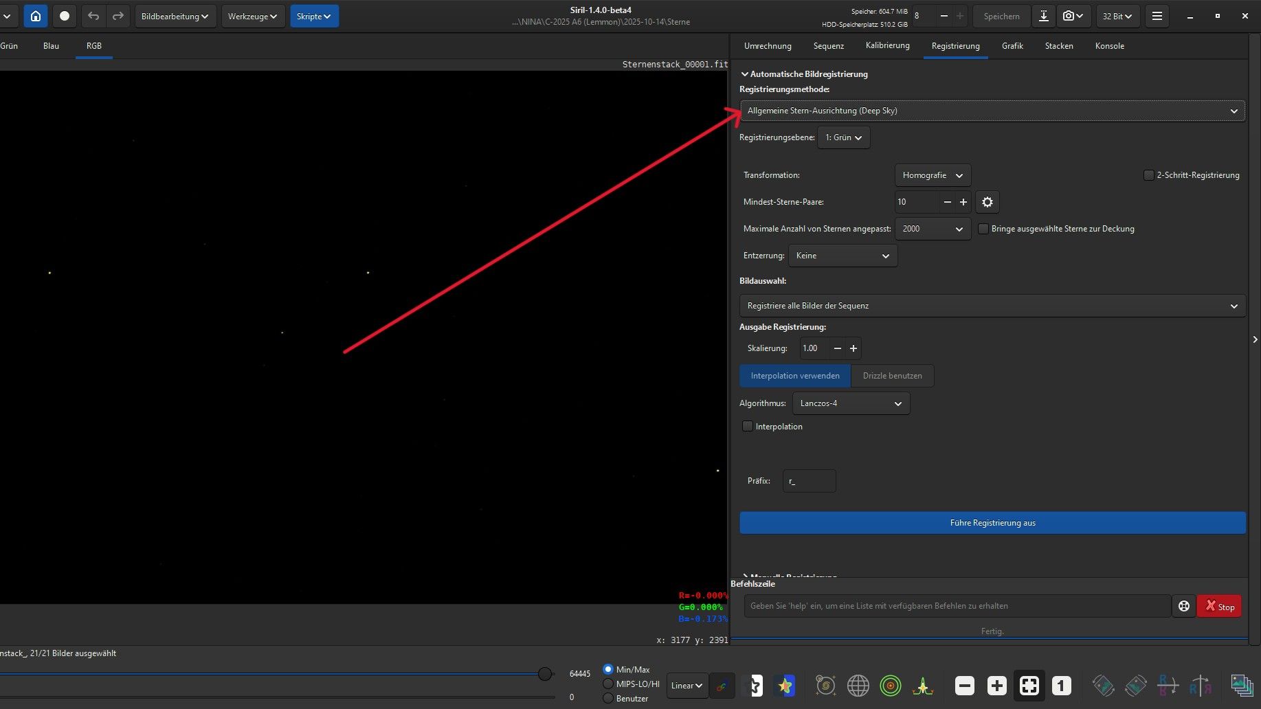 Nun wechseln wir zum Reiter „Registrierung“ und wählen die Option „Allgemeine-Sternausrichtung (DeepSky)“ aus.