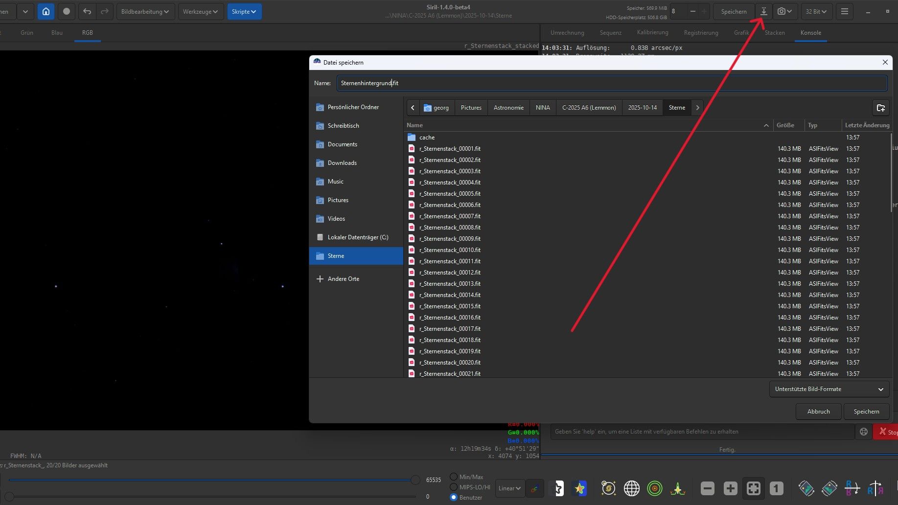 Als letzten Schritt des Sternenstacks speichern wir das noch das lineare Bild mit dem Namen „Sternenbild“ als 32-bit Fließkomma Fits ab.