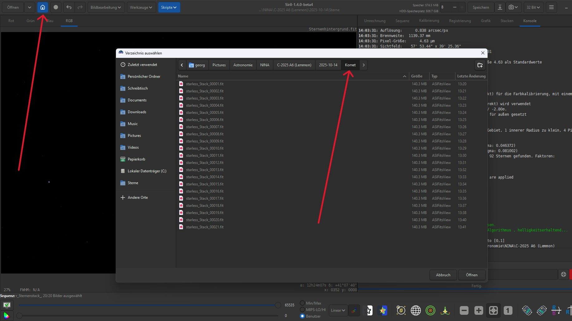 In Siril wechseln wir abermals das Heimverzeichnis und wählen diesmal den Ordner „Sterne“ dafür aus.