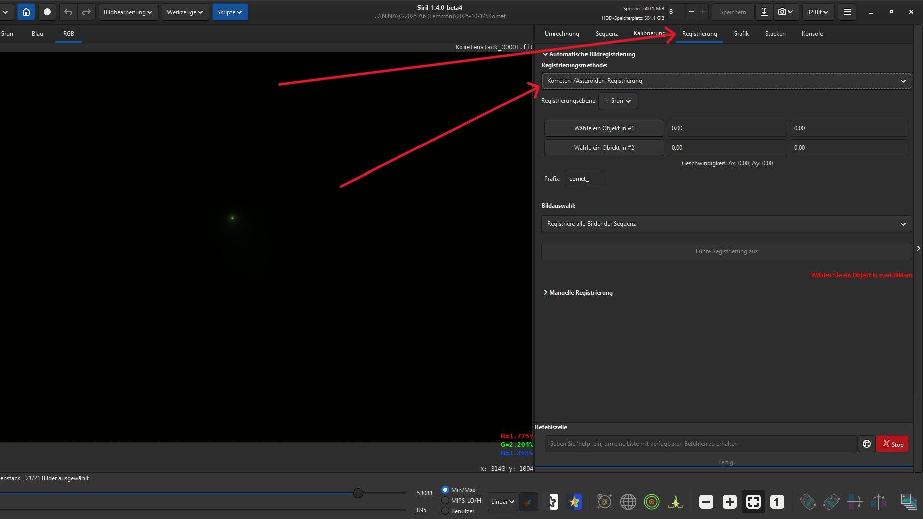 Nun wechseln wir zum Reiter „Registrierung“ und wählen die Option „Kometen-/Asteroiden-Registrierung“ aus.