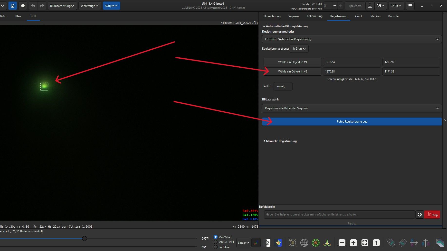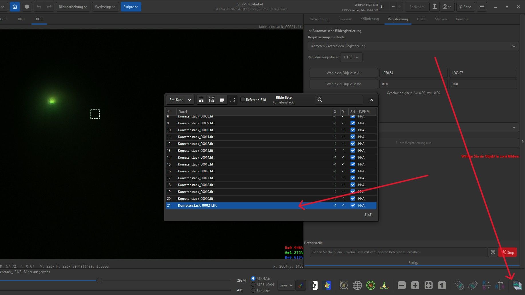 Im Referenzbild wird der Kometenkern mit einem Rechteck umrandet. Dann klicken wir auf „Wähle ein Objekt in 1#“.
