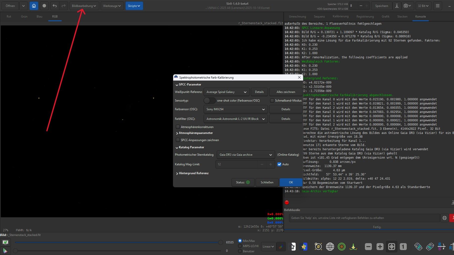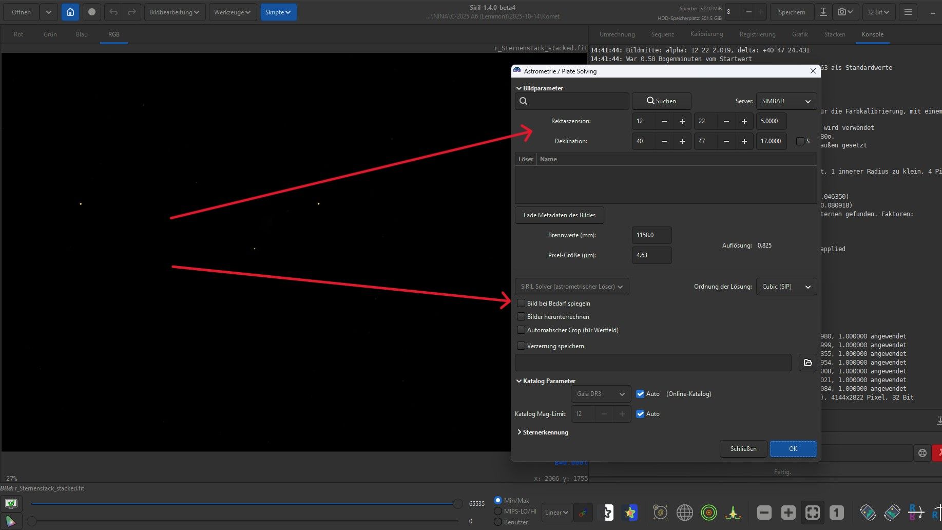 Wir führen über „Werkzeuge“ → „Astronomie“ eine „Astrometische Lösung (Plate Solving)“ durch.