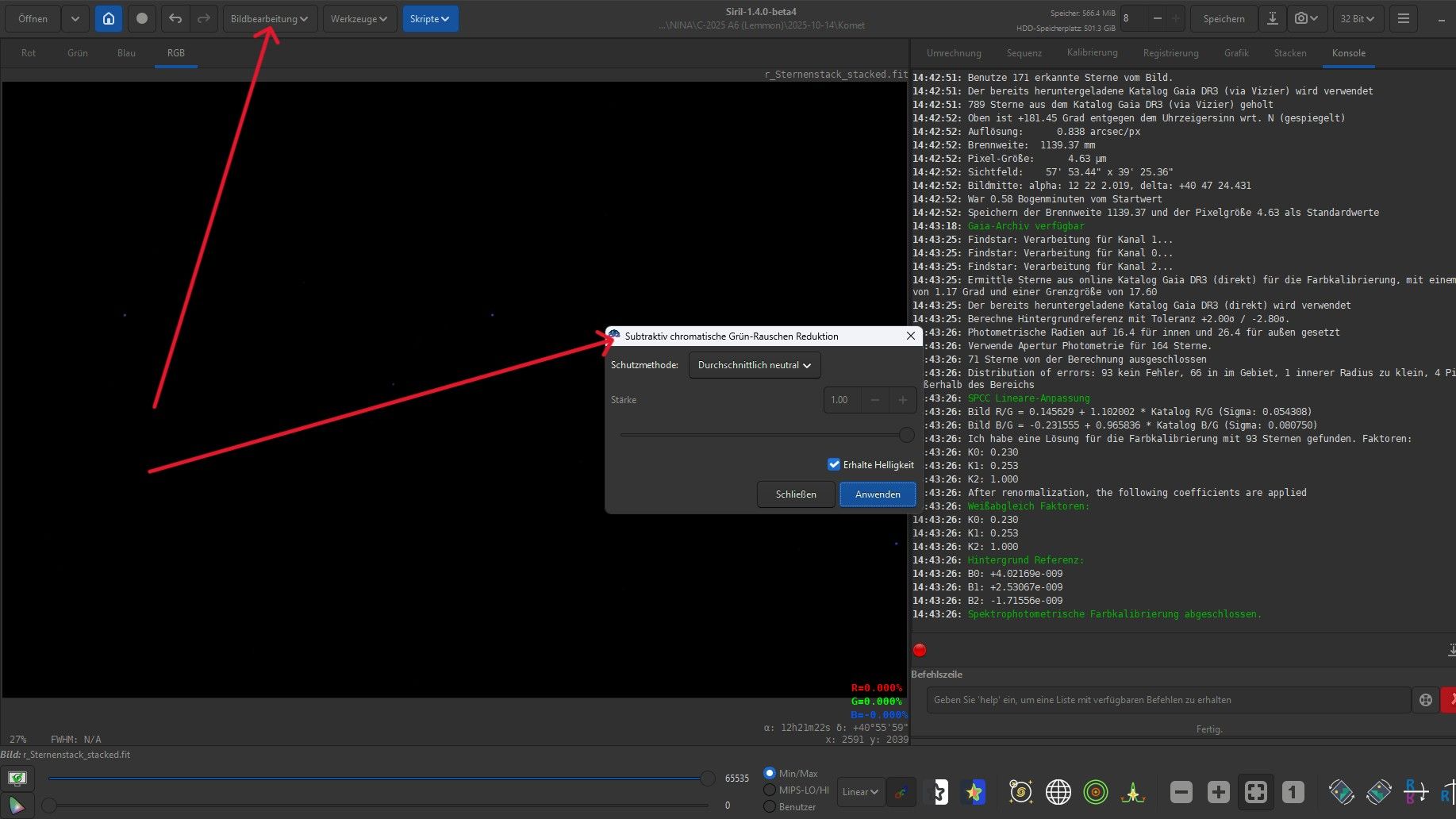 Unter Siril ist es mit einem geringen Mehraufwand möglich, die Strichspuren bei der Sternenentfernung sowie weitestgehend auch die Artefakte bei der Kometenentfernung zu vermeiden. Im Folgenden werden die dafür notwendigen Schritte detailliert beschrieben.