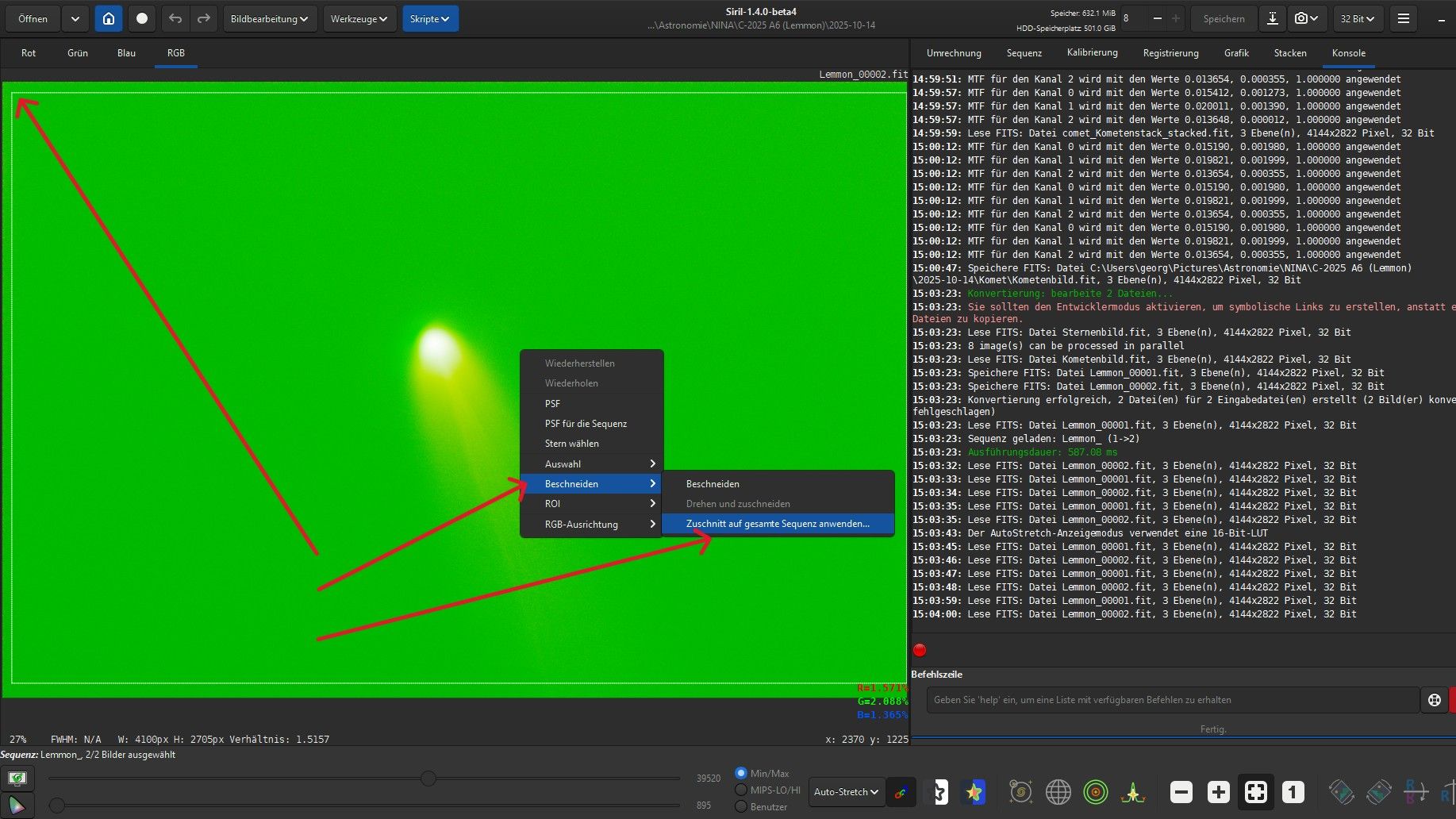 Dieser Zwischenschritt des Croppings ist notwendig, um später beim Bearbeiten des Kometen auch eine saubere Hintergrund-Extraktion durchführen zu können.