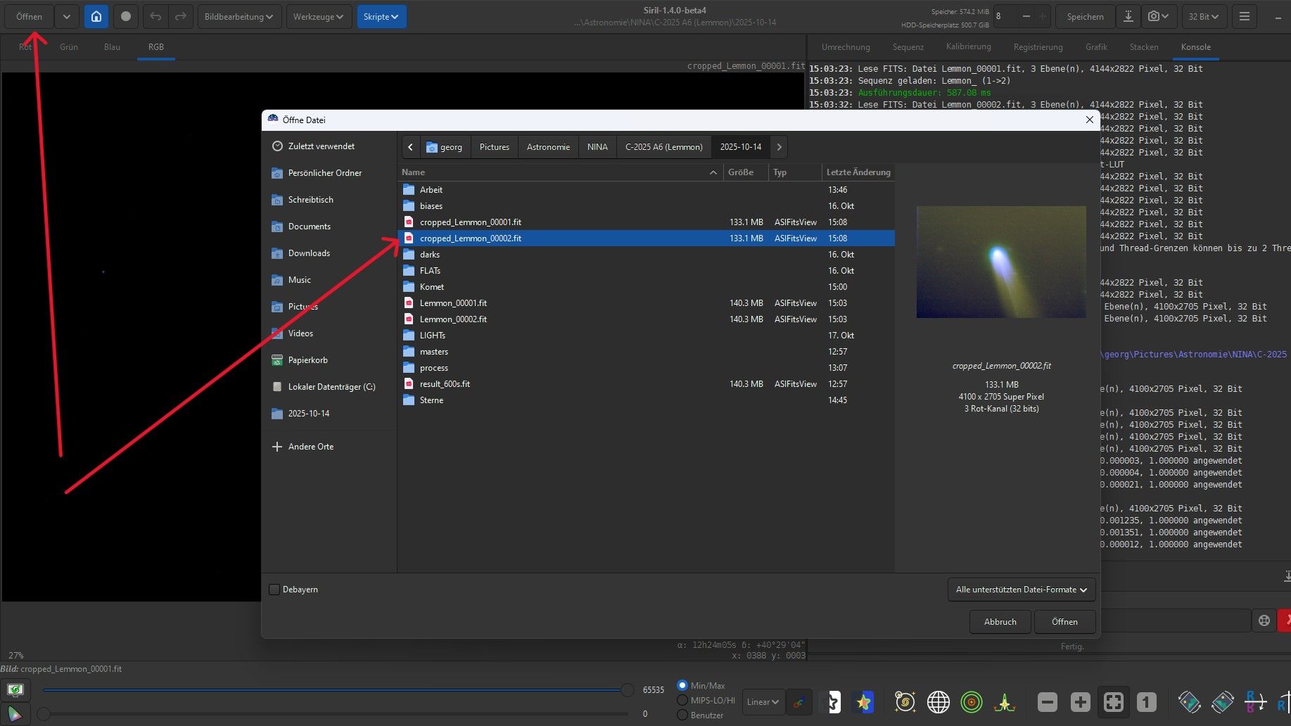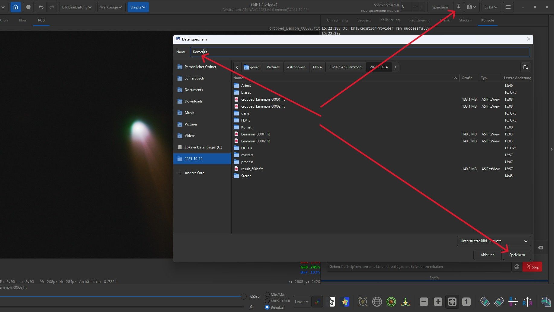 Als letzten Schritt speichern wir das noch lineare Bild mit dem Namen „Kometenbild“ als 32-bit Fließkomma Fits ab.