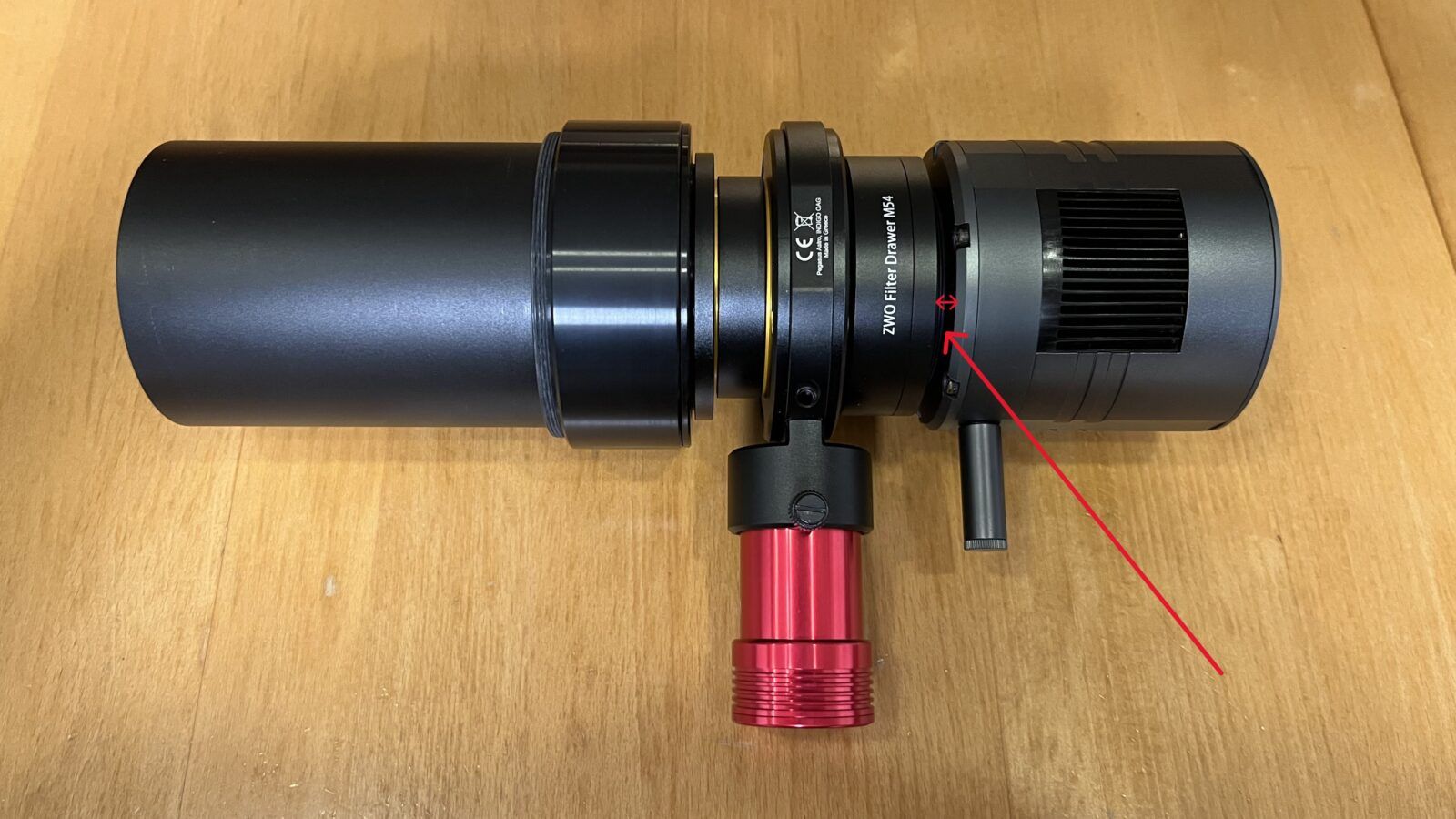 Der Grund für diese Lücke liegt in der standardisierten Bauart vieler Komponenten: Die Hauptkamera, die SVBony SV405CC, besitzt am Eingang ein männliches T2-Gewinde (M42 x 0.75mm). Gängige Filterschubladen (mit T2-Anschluss) besitzen ebenfalls ein männliches T2-Gewinde, das in Richtung Kamera zeigen muss, um die korrekte Filterrichtung beizubehalten.