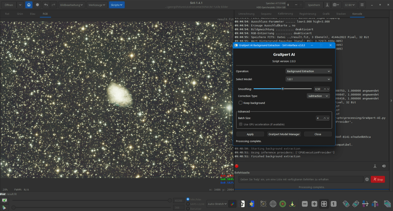 Als zweites folgt immer die Hintergrund-Extraktion, wofür ich GraXpert nutze. (Skripte – Python-Skripte – Processing – GraXpert-AI)