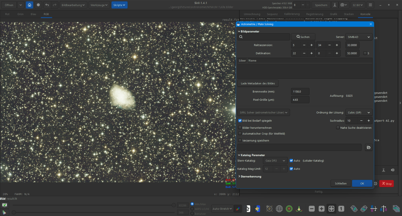 Anschließend lässt man das Bild astrometrisch lösen. (Werkzeuge – Astrometrie – Astrometrische Lösung)