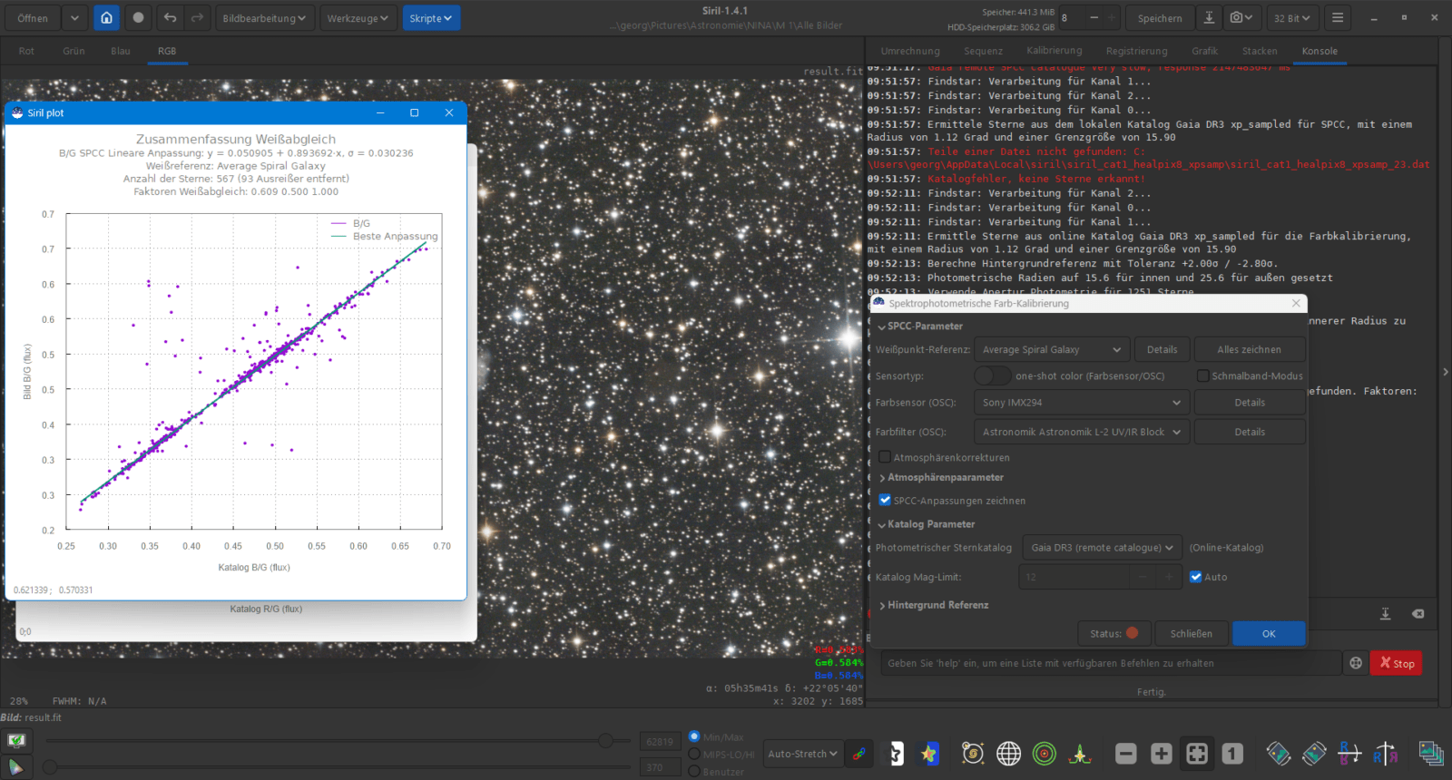 In Siril gibt es mittlerweile viele Wege und noch mehr Tools, um ein lineares Bild zu strecken. Hier möchte ich meine persönliche Reihenfolge vorstellen – also einen festen Workflow, mit dem ich am besten fahre. Da es mir hier um den roten Faden geht, erkläre ich nicht jedes Tool im Detail, sondern konzentriere mich auf die Schritte, die einen Rohstack in ein schönes Gesamtkunstwerk verwandeln.