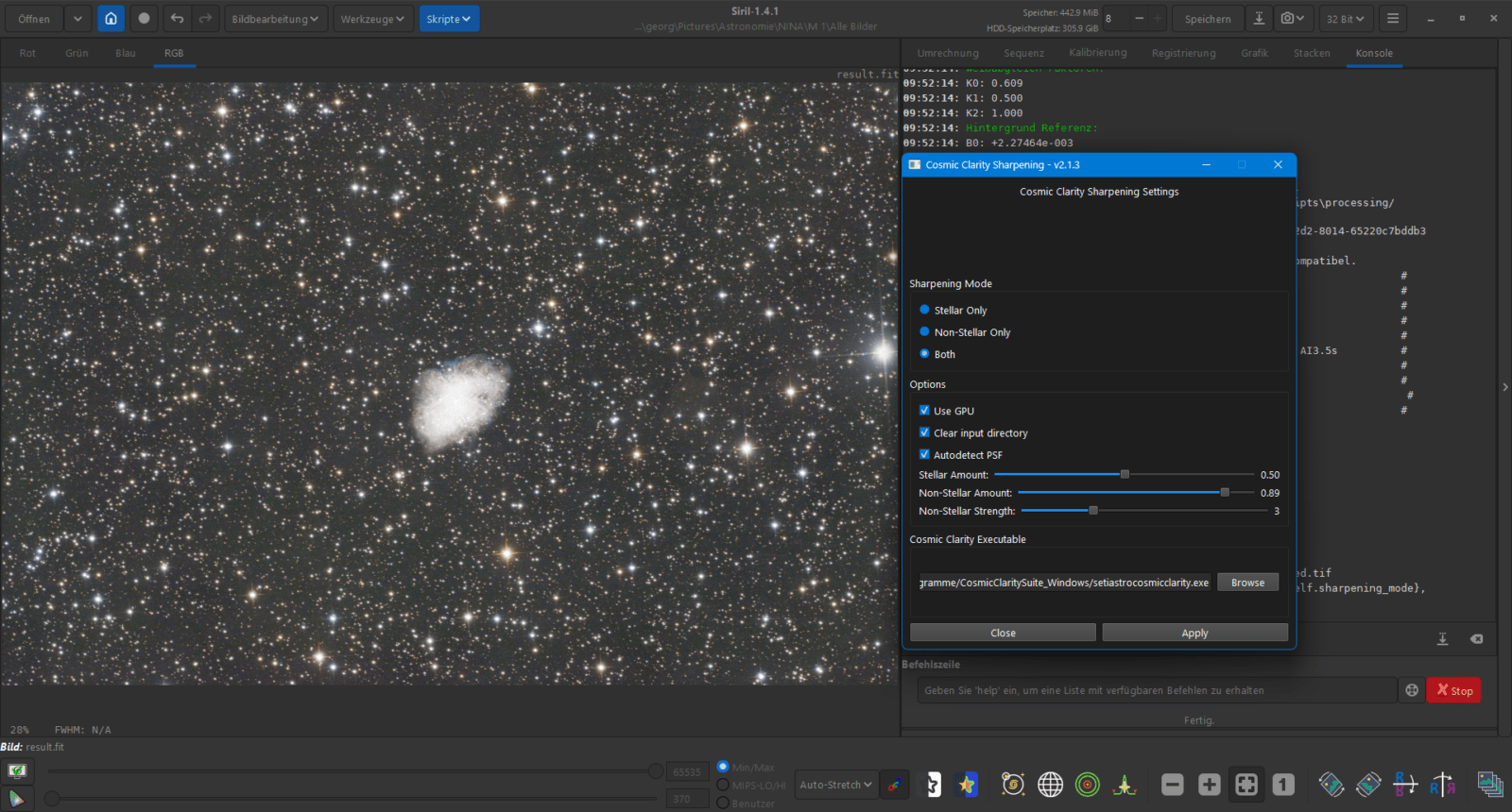 Mein nächster Schritt ist das Schärfen des noch linearen Bildes mit Cosmic Clarity Sharpening. Hier wähle ich die Option „Both“ und erhöhe den „Non Stellar Amount“ ein wenig. (Skripte – Python-Skripte – Processing – CosmicClarity_Sharpen)