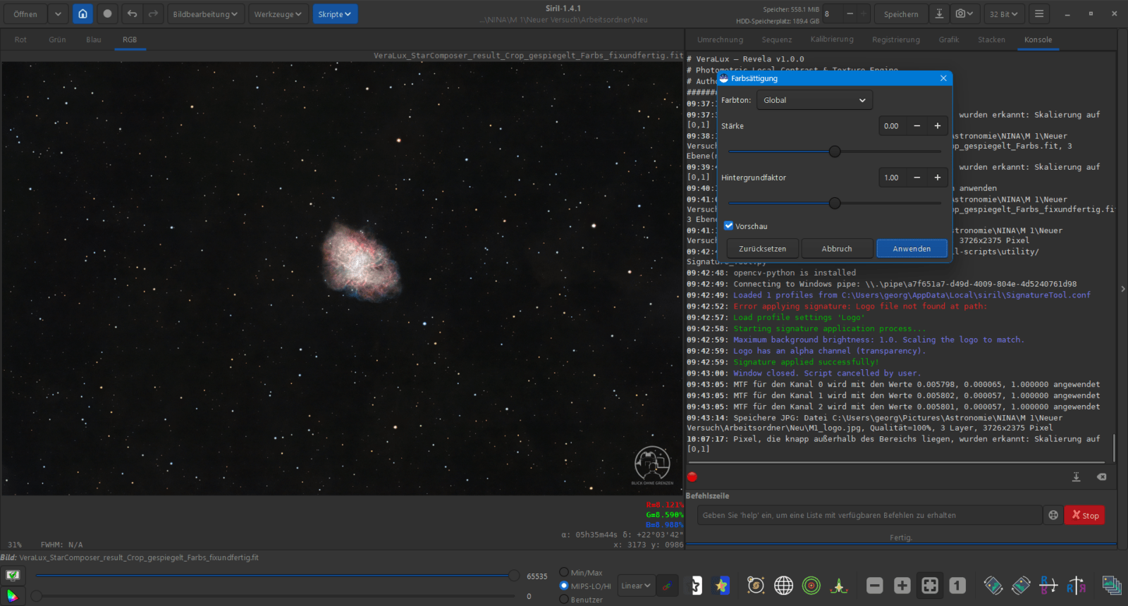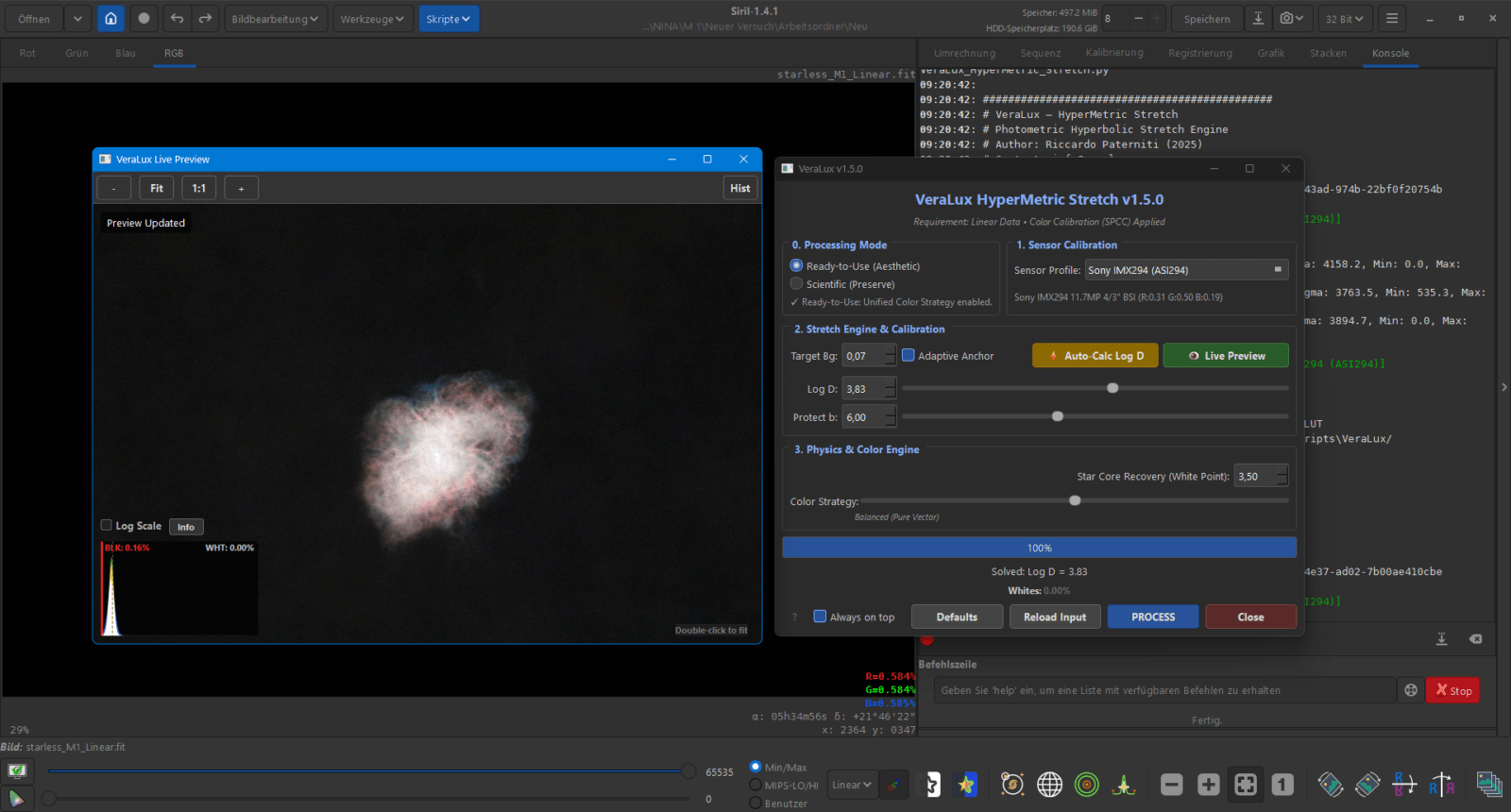 Mit Hypermetric Stretch führe ich ein „Auto-Calc Log“ durch und prüfe das Objekt in der Live-Preview. Den Grad der Streckung wähle ich über „Target Bg“ und passe mit „Log D“ die Farbsättigung manuell an. (Skripte – Python-Skripte – VeraLux – VeraLux_HyperMetric_Stretch)