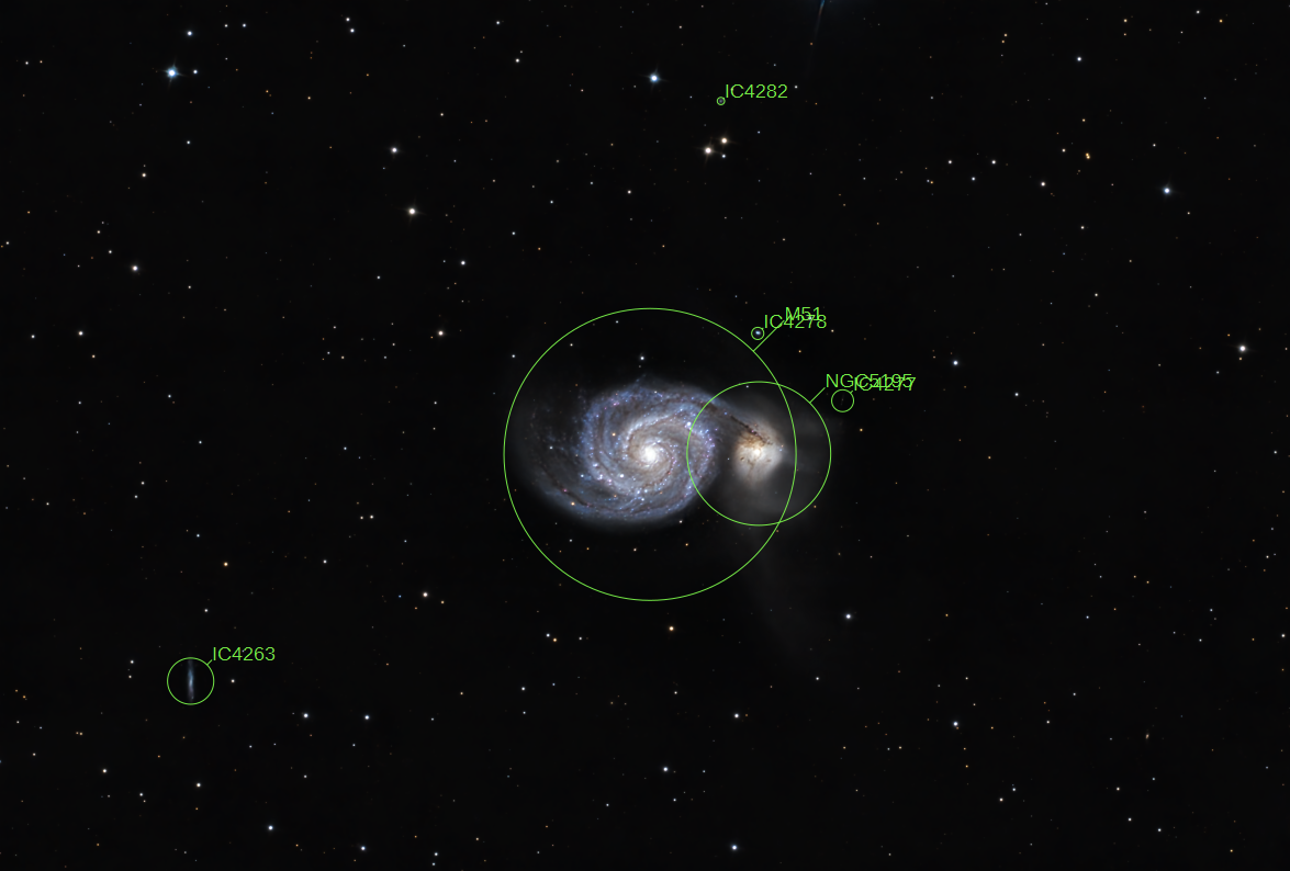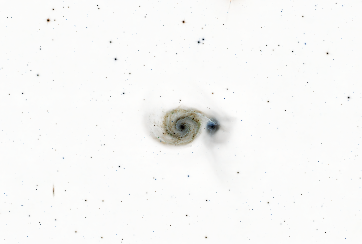 Das Hauptproblem dabei ist die Lichtverschmutzung: In dieser Richtung liegen die Lichtglocken von Nürnberg und Roth, was den Kontrast massiv beeinträchtigt und die Bildbearbeitung (besonders den Gradientenabzug) extrem mühsam macht. Trotz dieser Widrigkeiten bin ich mit dem Ergebnis zufrieden, da die feinen Details in den Spiralarmen und die Brücke zum Begleiter NGC 5195 dennoch gut ausgearbeitet werden konnten.